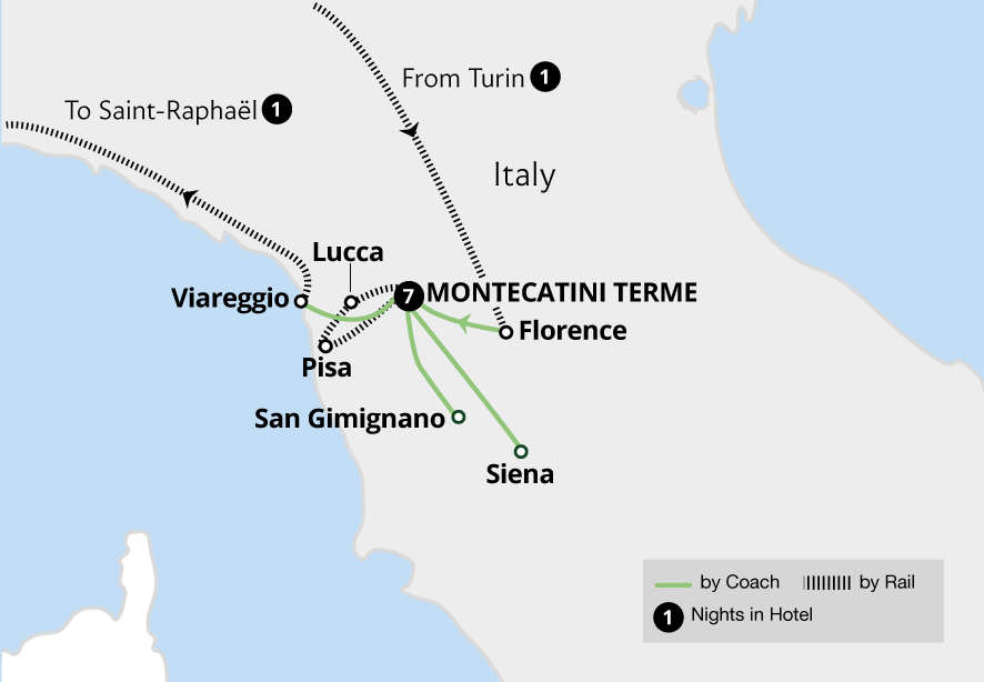 Enjoy a holiday that captures the essence of Tuscany, travelling to and from the Tuscan spa town of Montecatini Terme by rail. This UNESCO World Heritage site is an ideal base for exploring this scenic and cultural region. From the grand Renaissance art and architecture of Florence to the fantastic shell-shaped Piazza del Campo and medieval...