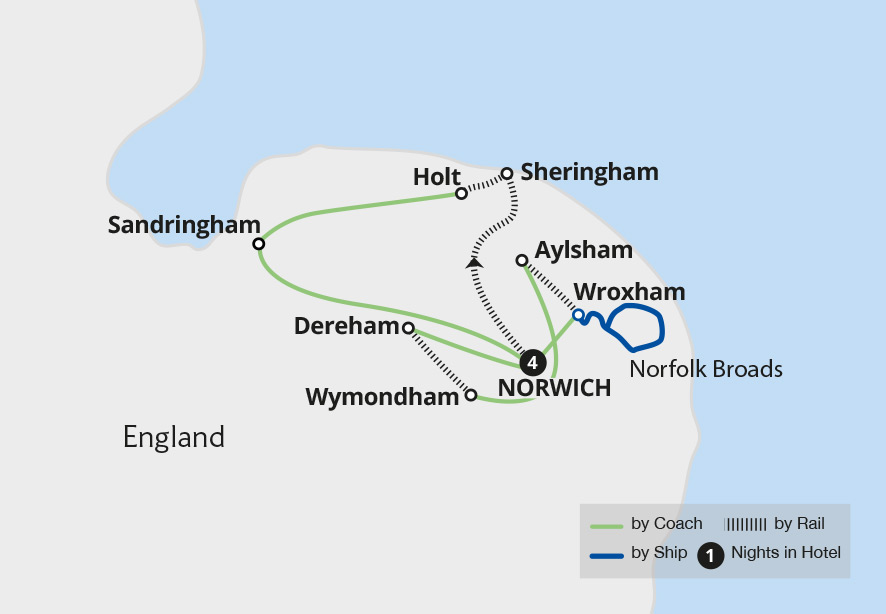 Discover the rich heritage and natural beauty of Norfolk and Norwich on a journey filled with historic railways, waterways and royal charm. Explore the medieval city of Norwich on a guided tour, cruise along the Norfolk Broads on a Mississippi paddle boat and step back in time on scenic journeys with the Mid and North Norfolk railways. We also...