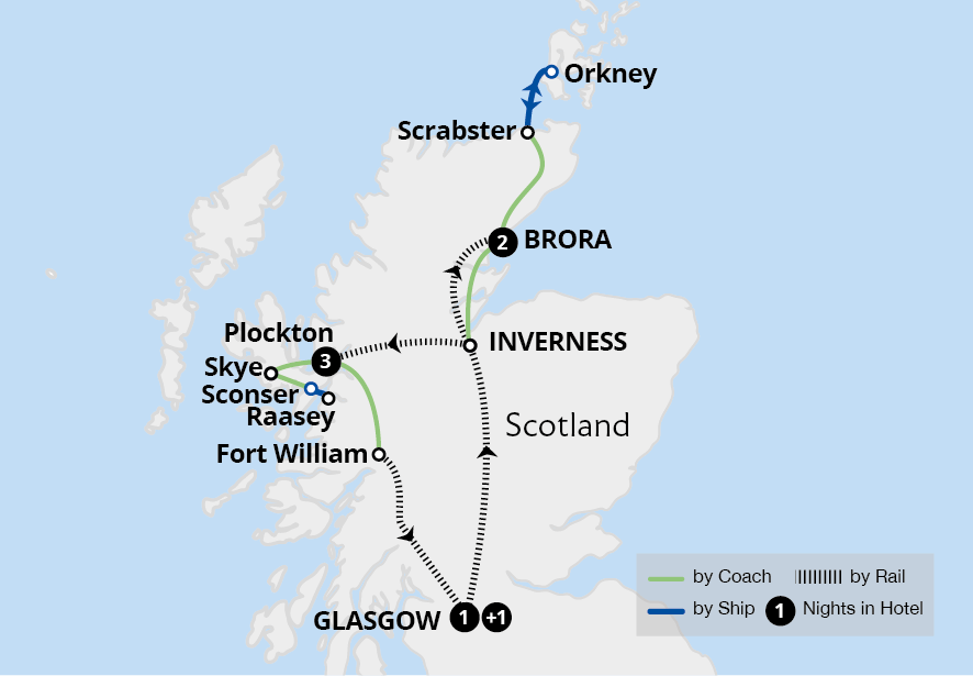 Let the rugged beauty of Scotland capture your heart on this seven-night holiday. Starting in Glasgow, journey through stunning landscapes to Scotland's mystic north. Tour the Orkney Islands and discover ancient Neolithic sites including Skara Brae and marvel at the beauty of the great houses of the northern Highlands, Dunrobin and Dunvegan...
